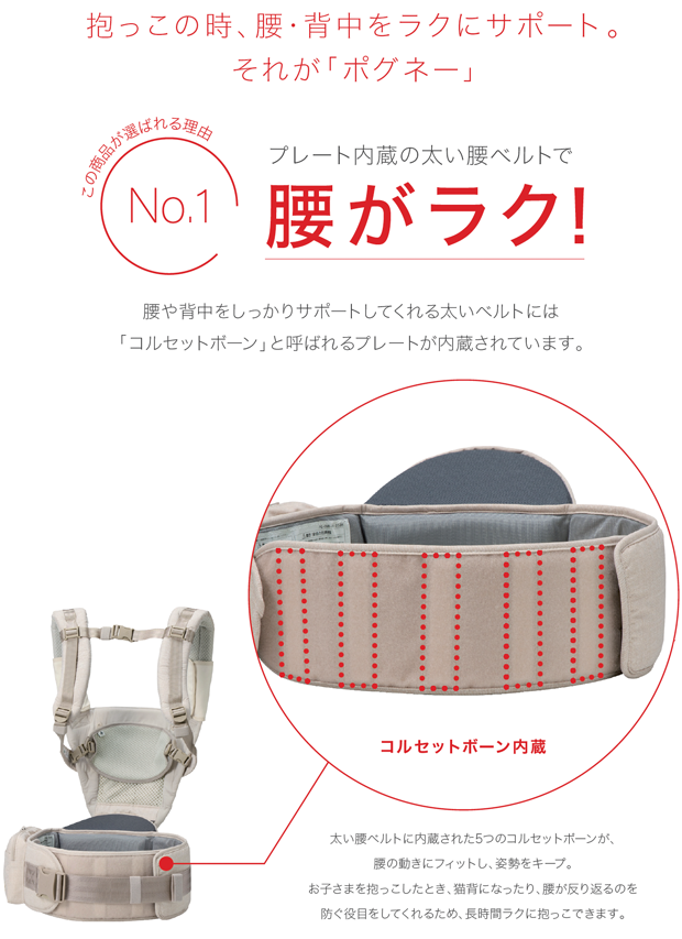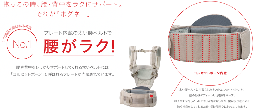 コルセットボーン内蔵の太いベルトが、ママ・パパの腰をサポート