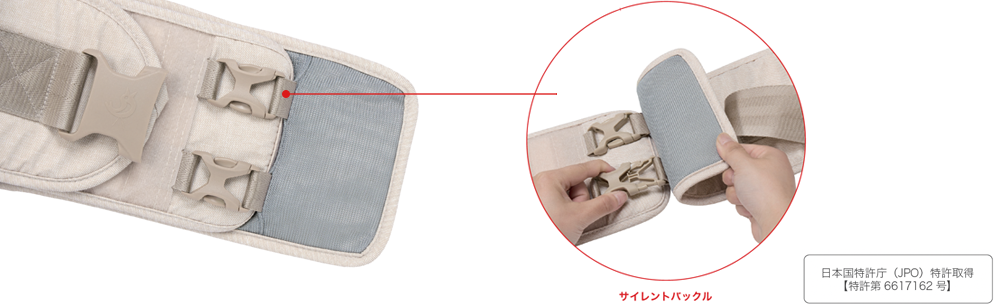 そんなお悩みを解決するのが「サイレントバックル」。腰ベルトを外すときは、面ファスナーを剥がさず、このバックルを使って静かに