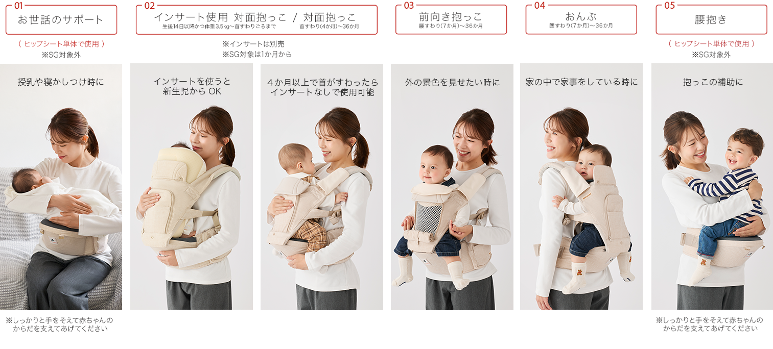 新生児期のお世話のサポートや、表情がしっかり見えて安心の対面抱っこ、好奇心でいっぱいの時期にうれしい前向き抱っこ、